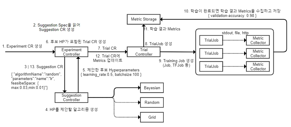 Experiment 마다 Suggestion CR 하나를 생성하는데, Experiment Controller에서 Experiment CR의 Search Parameter와 Search Algorithm 설정에 따라 내부적으로 Suggestion CR을 생성하고 Suggestion Controller에 전달하면, Suggestion Controller는 Search Algorithm을 생성한 후, Search Algorithm에서 제안한 Hyperparameter를 Experiment Controller에 전달한다.